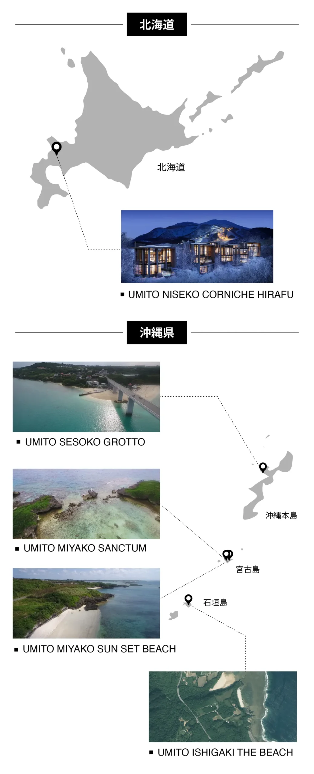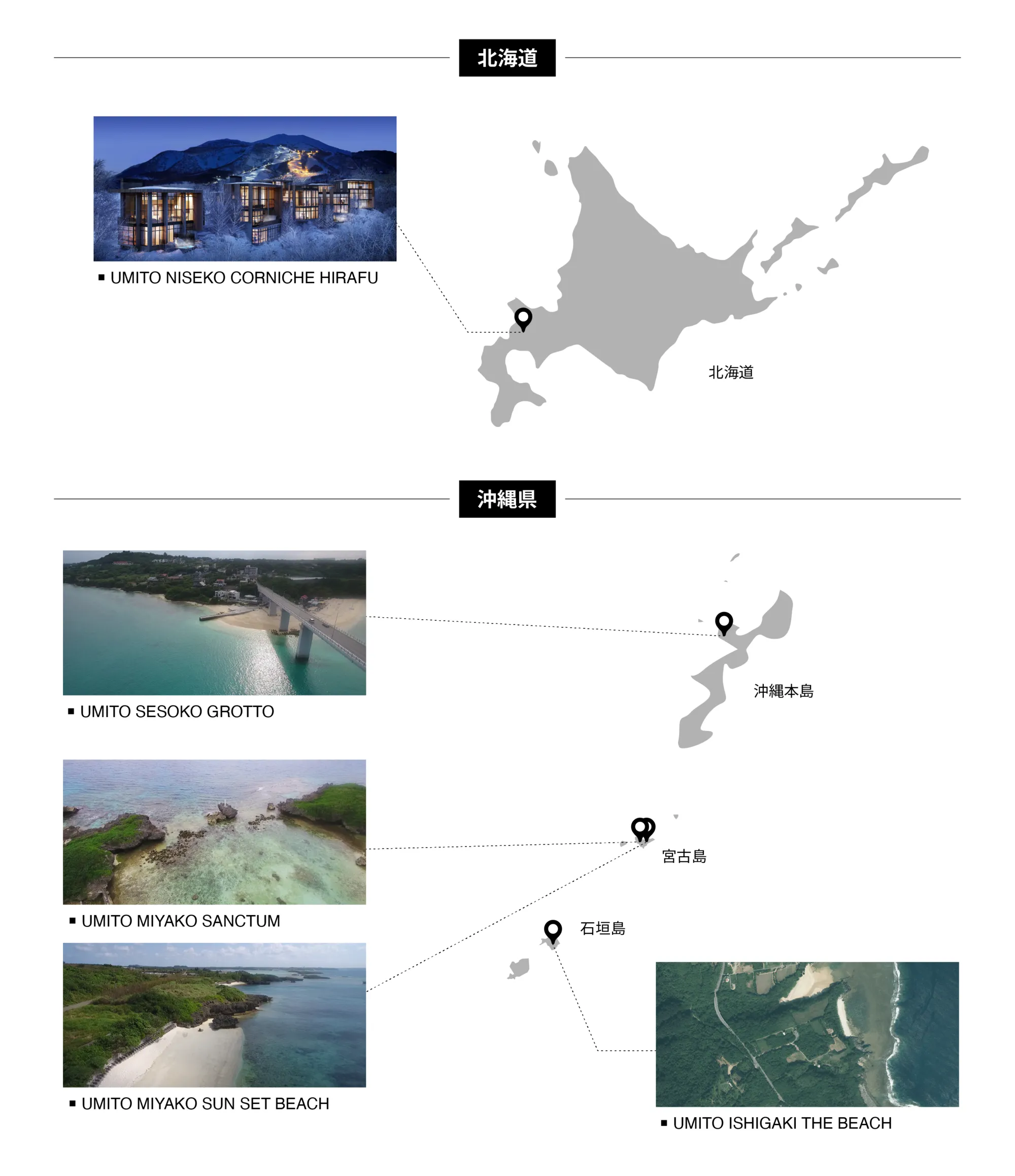 沖縄本島・離島はUMITOのコンセプトどおり海の目の前であり、対する北海道・ニセコは羊蹄山を望む壮大なロケーション。どこも豊かな自然環境が魅力的な場所だ。
