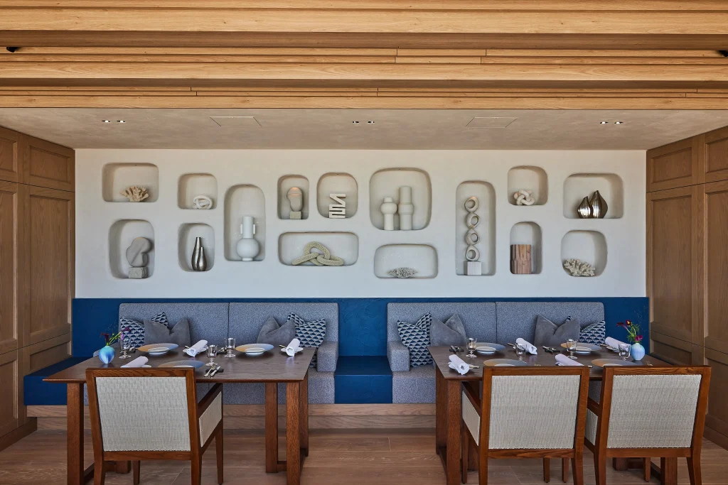 海沿いのレストランということで、ここから見える景色に呼応したものが内装にも反映されています。例えばインテリアの藍色だったり、クッションの波模様柄がわかりやすいですね。