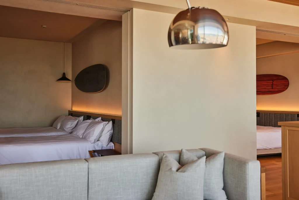 カジュアルラグジュアリーというコンセプトと、内装やインテリアの選定基準を統一しました。ここでお客様に得ていただきたいチル体験はレストランでもホテルでも変わらないので、そこはブレないようにしたい。でも全く同じものを使用しているというわけではなく、同じコンセプトの中でも少しだけ変えています。例えば照明は、レストランではマットな質感のもの、客室では艶のある鏡面のものと違うものを使用しています。