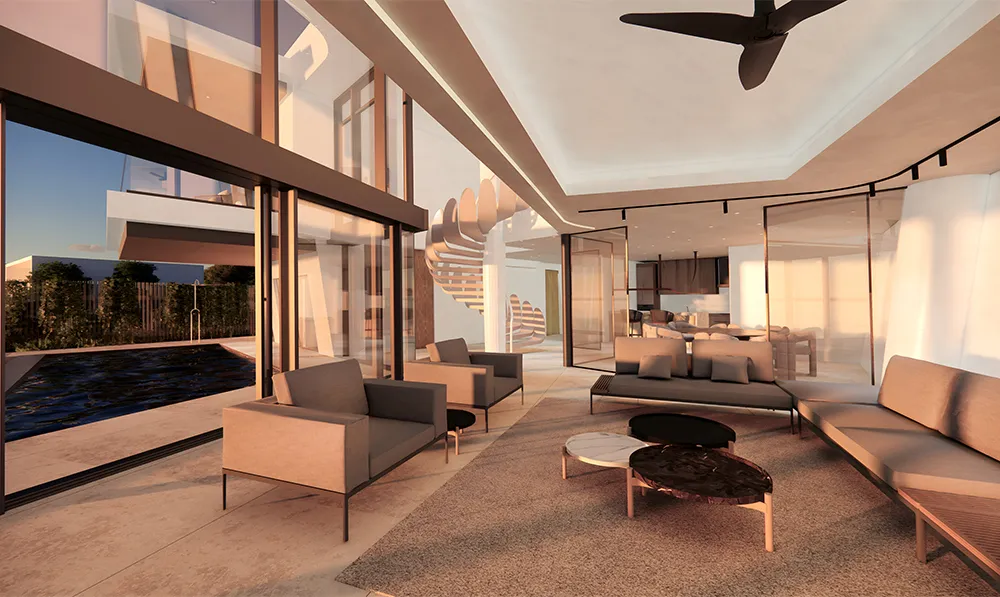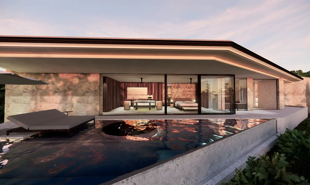 大自然とアートが融合する地で夕日に輝くヴィラ