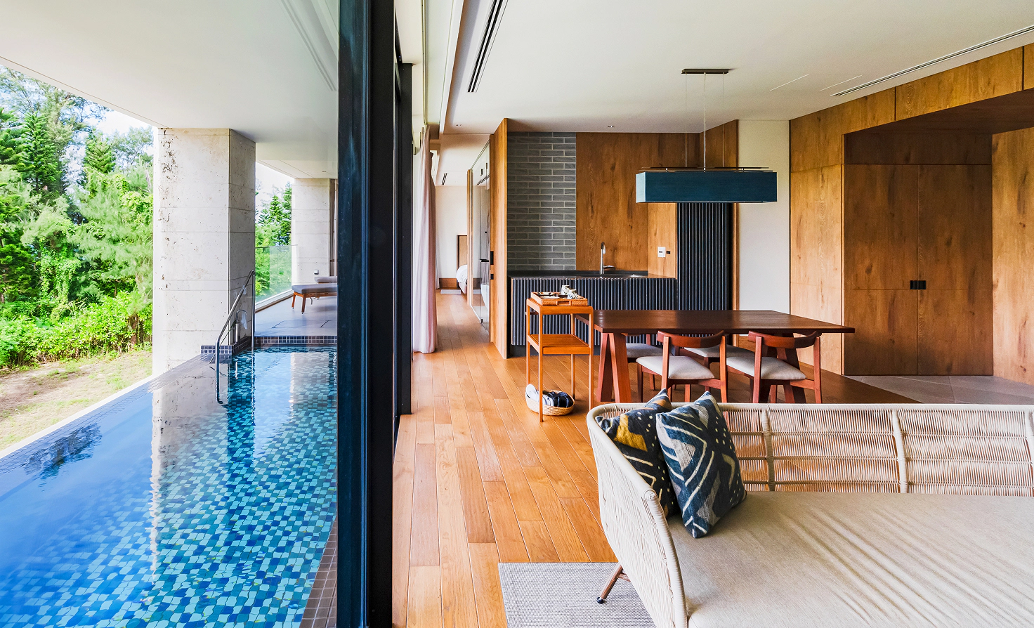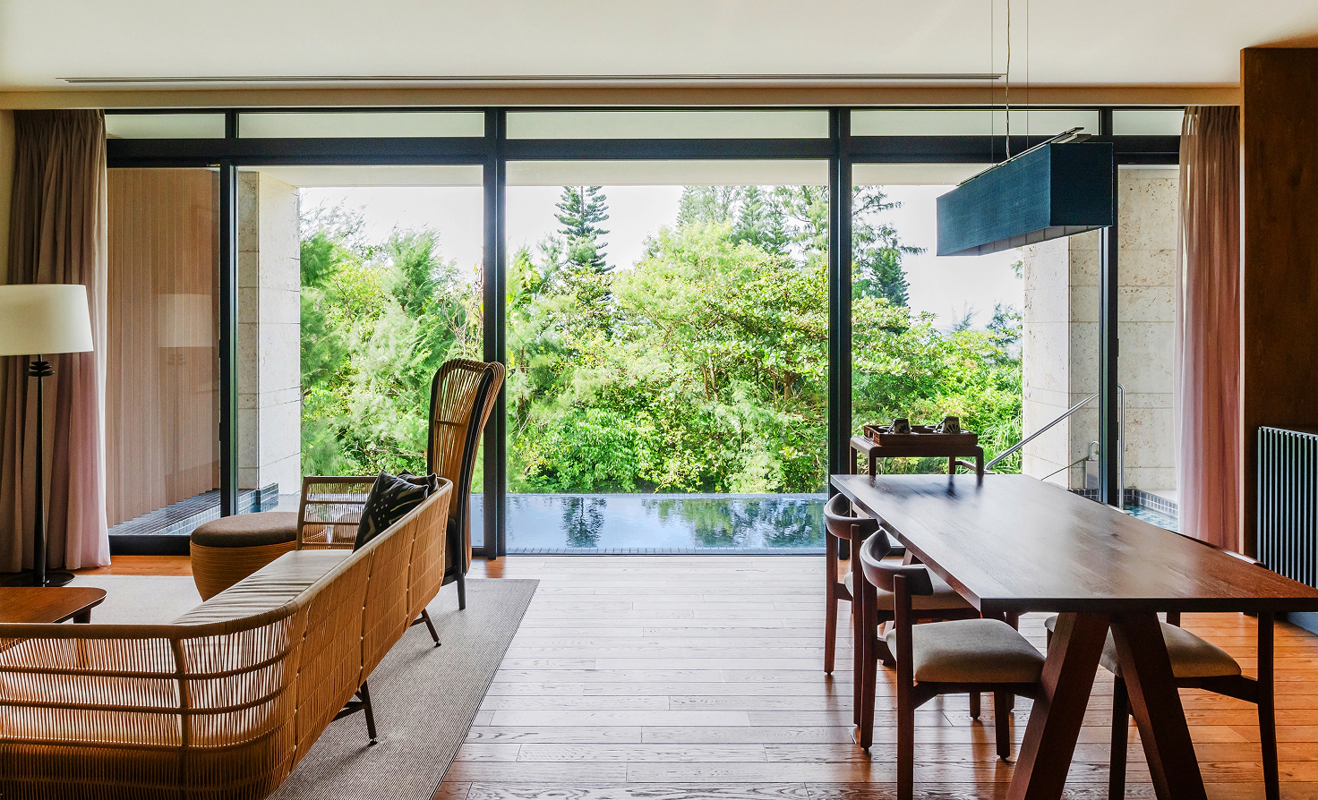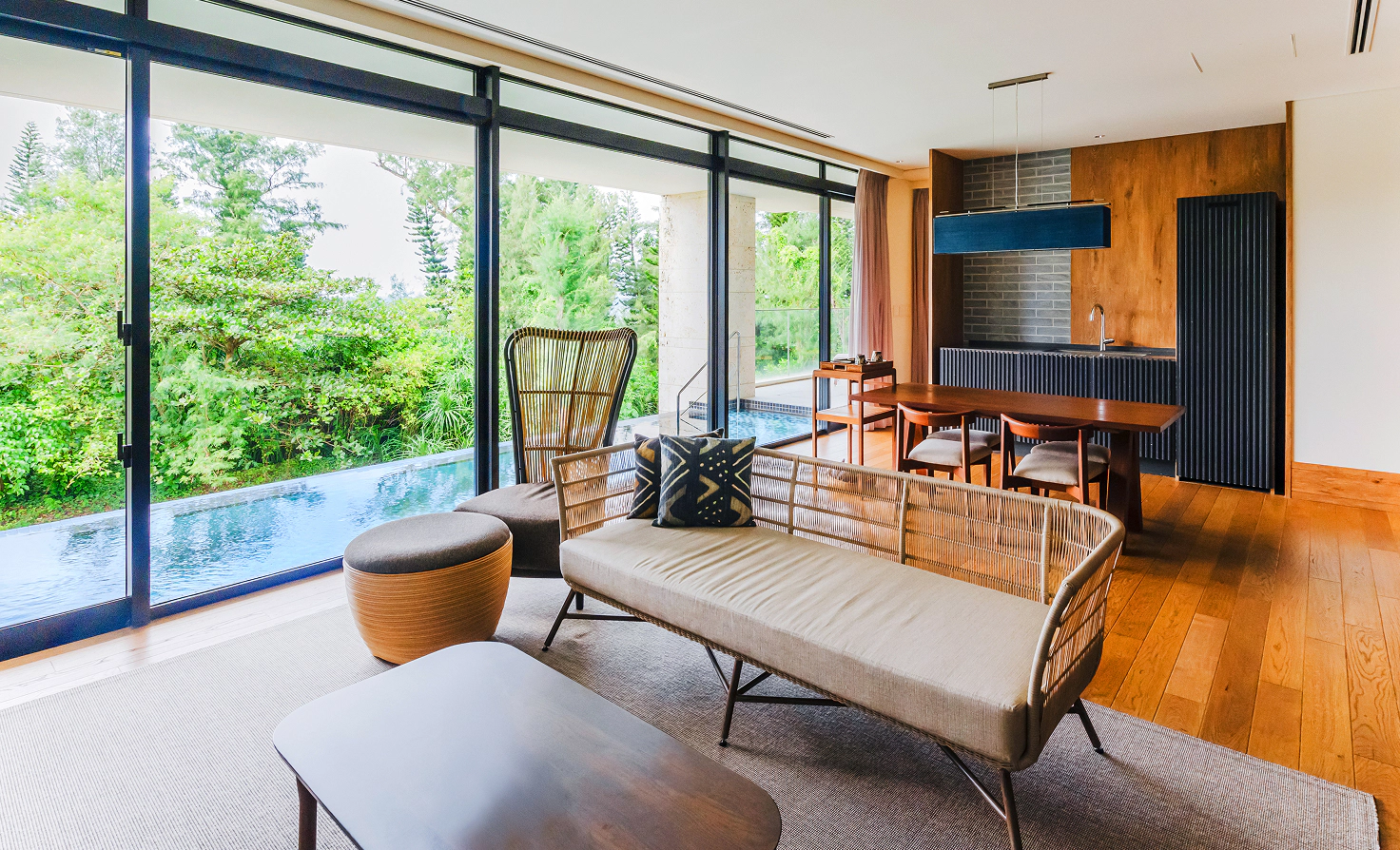 Spacious living room overlooking the private pool