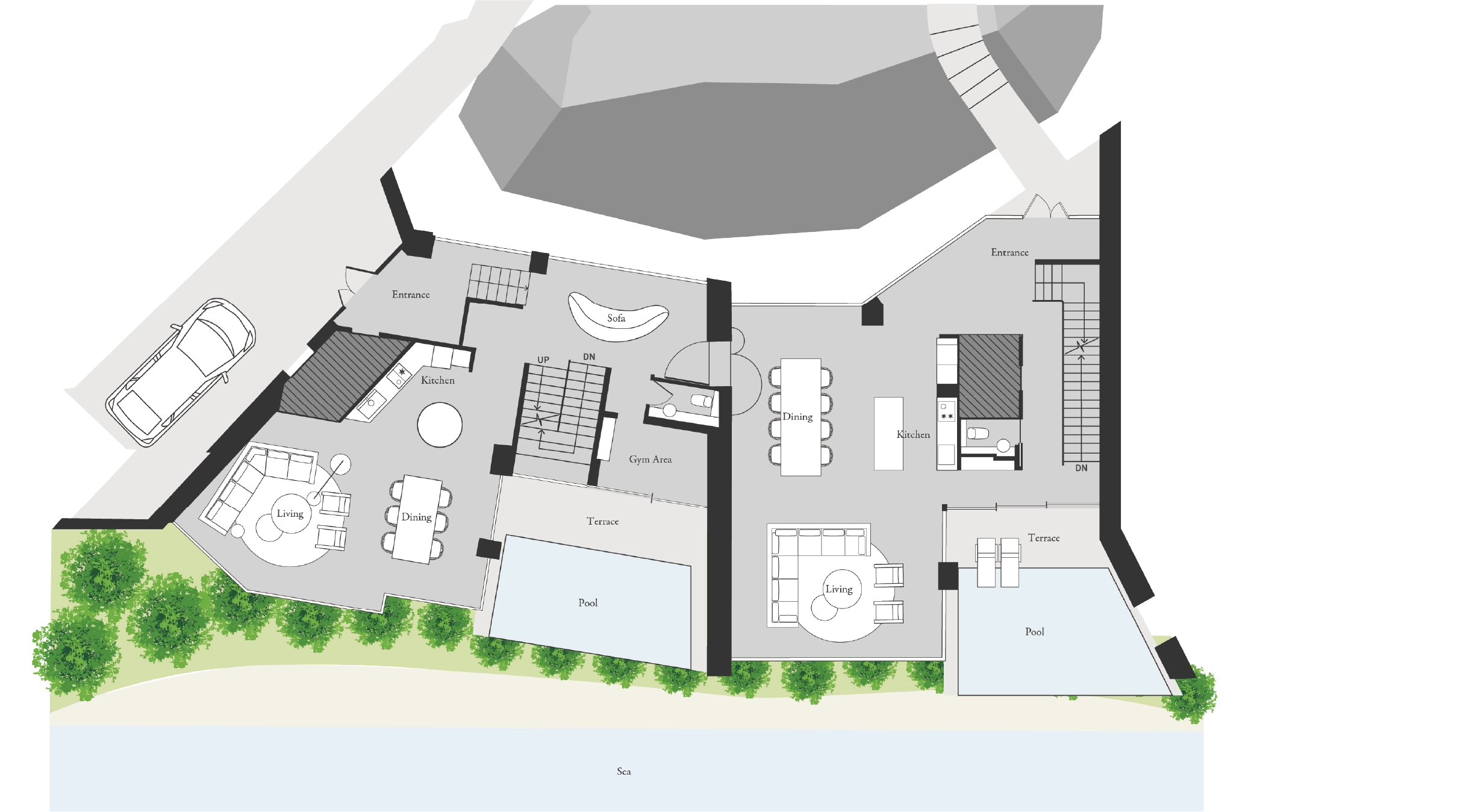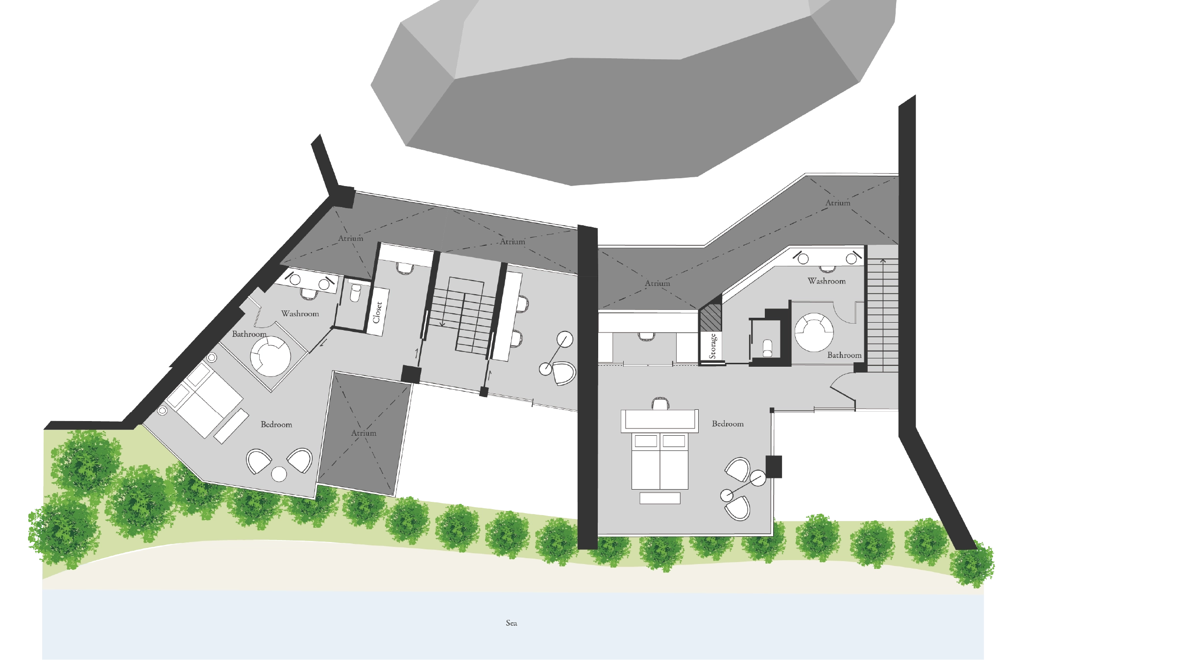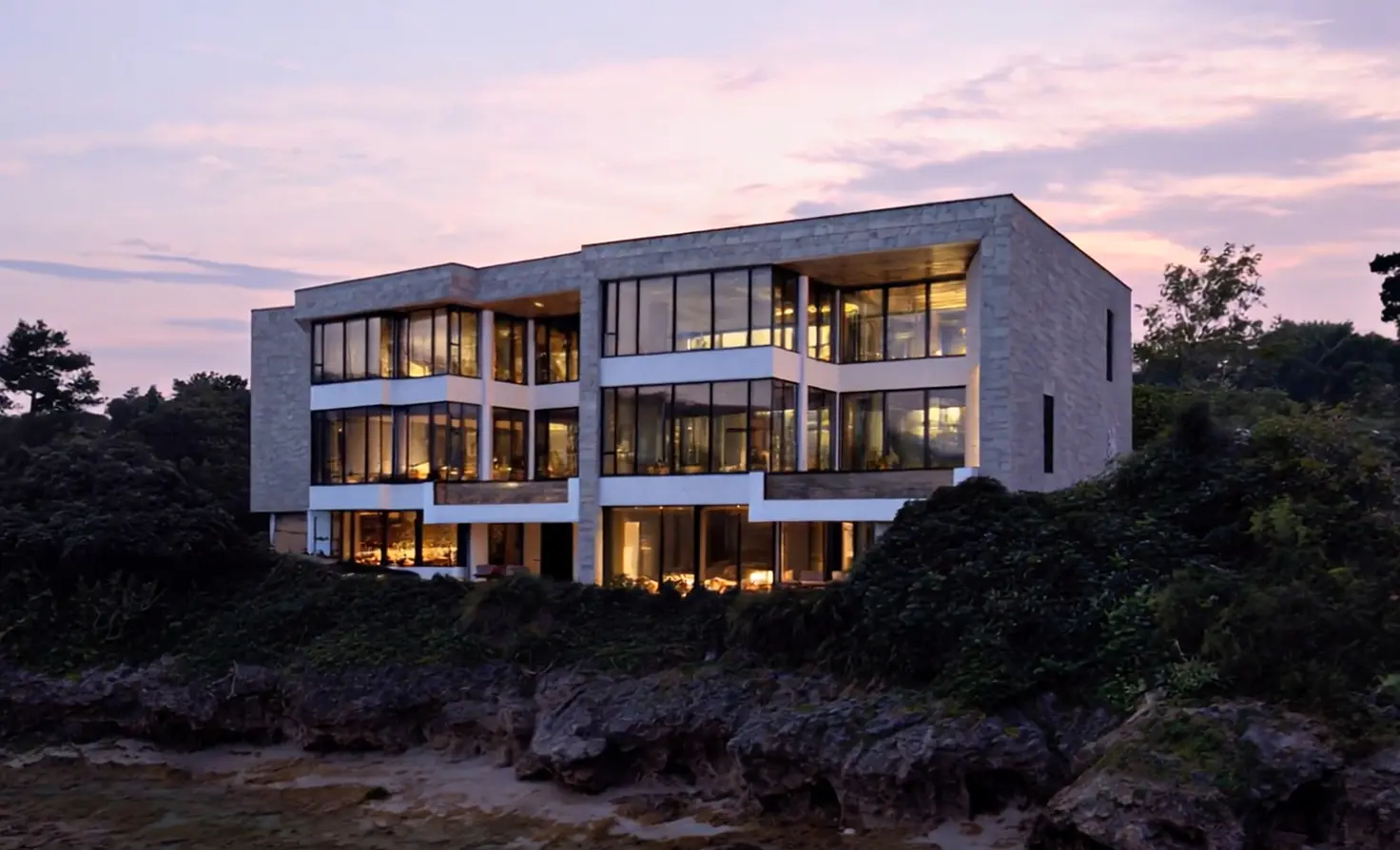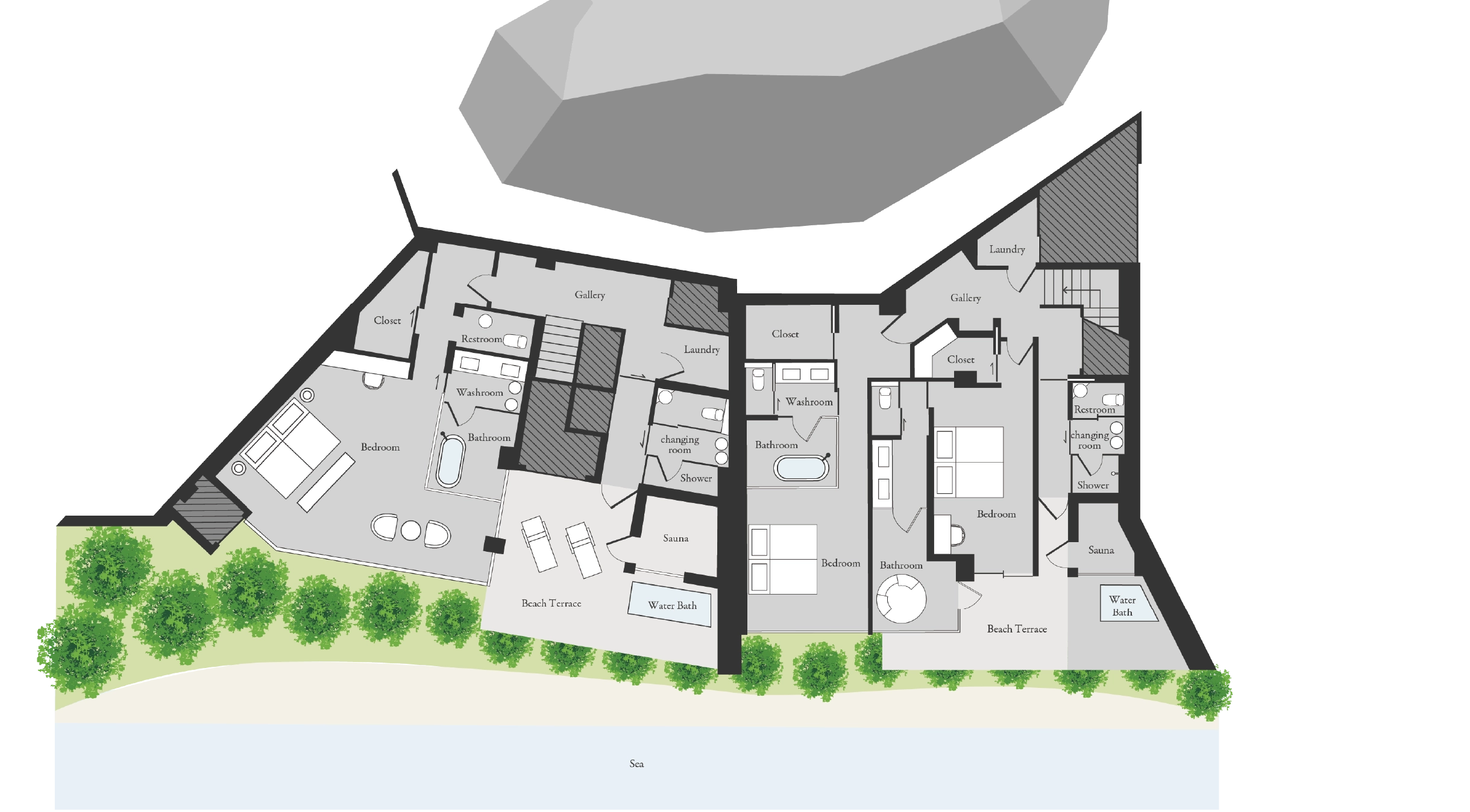 In the sauna room connected to nature, you'll be enveloped in profound sensations alongside the ocean view stretching beyond the windows.