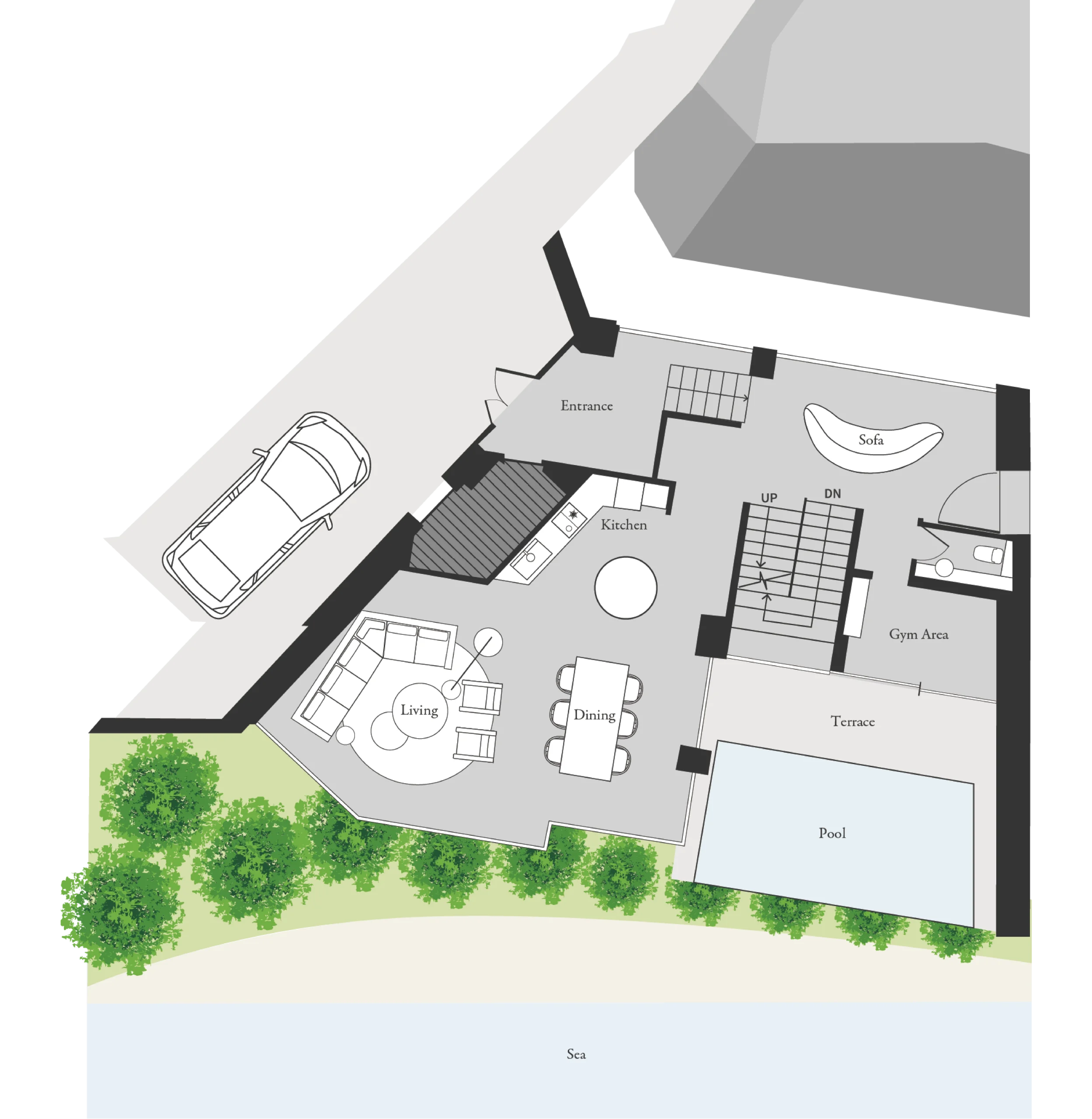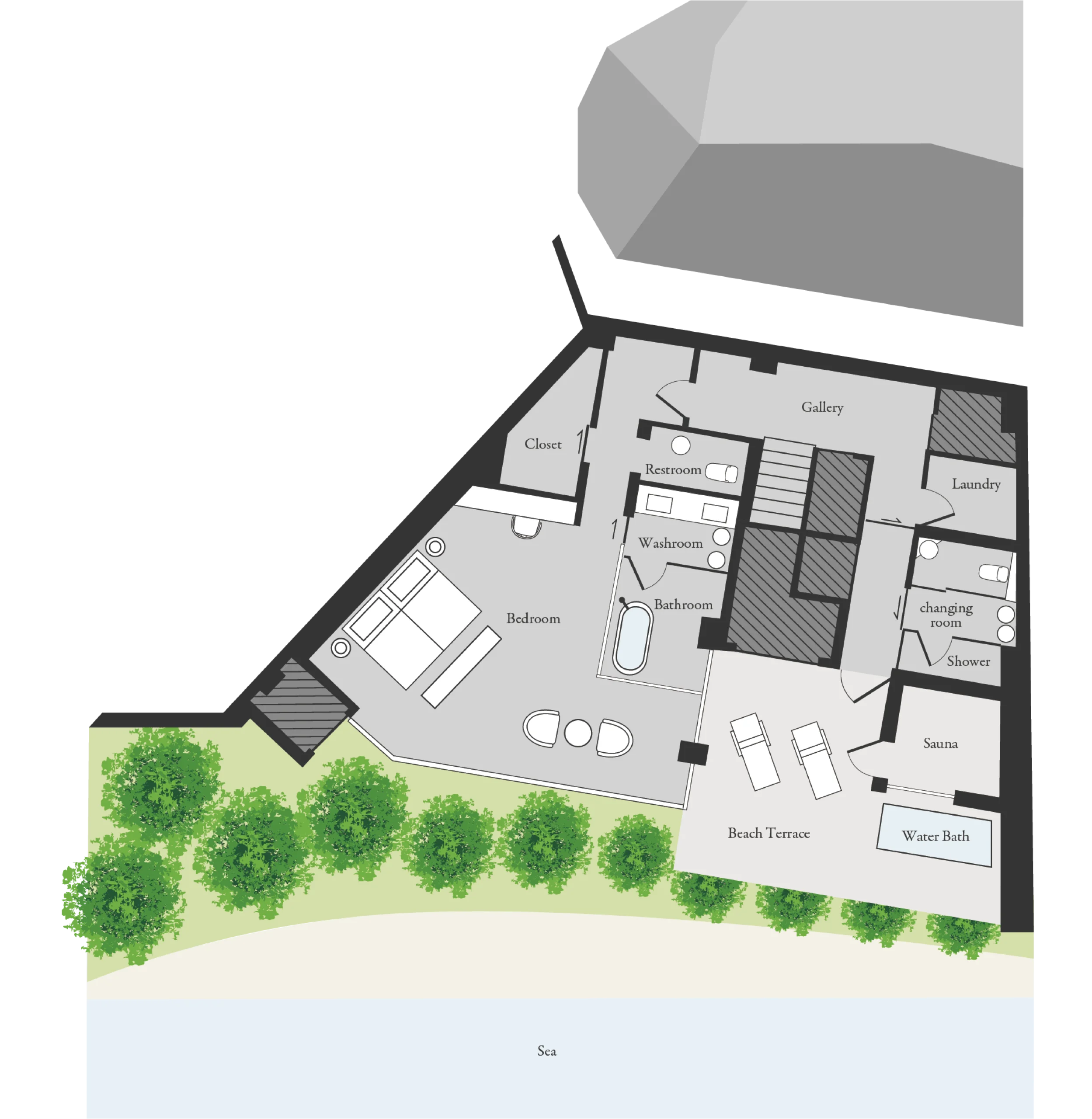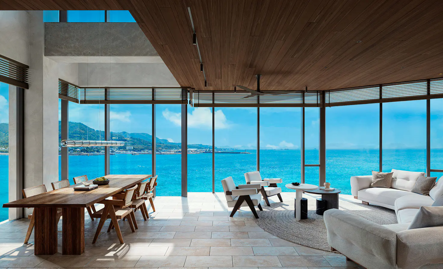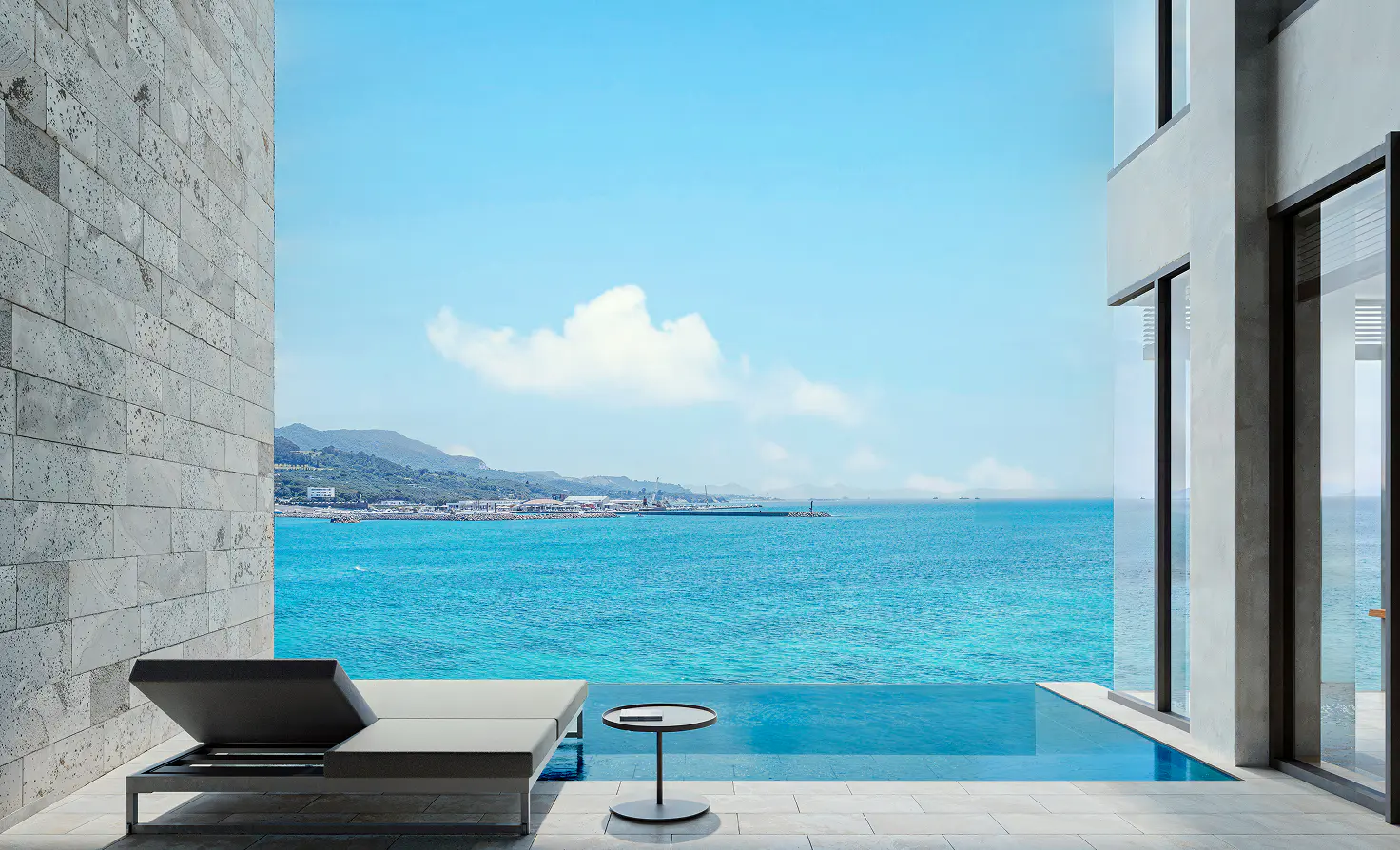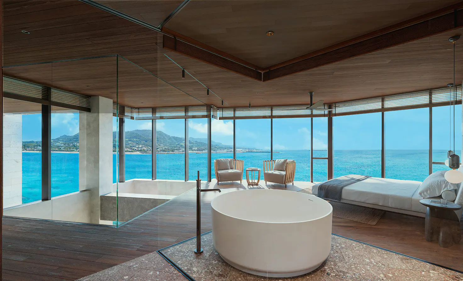 In this space where your gaze flows freely up and down, you can savor blissful relaxation that deeply unravels body and mind while looking down upon the crystal-clear sea and pool.