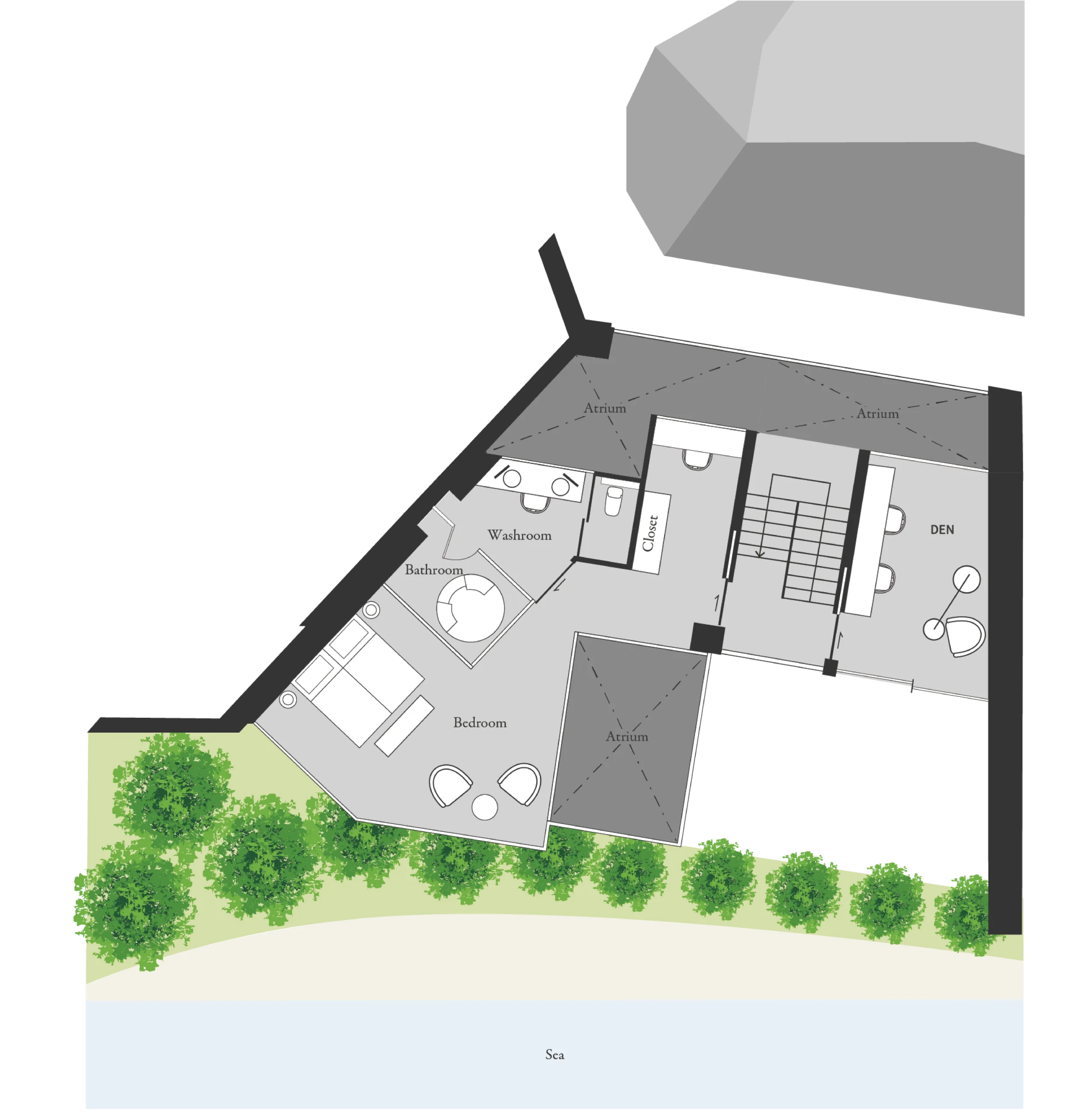 Ascending the staircase, embraced by Ryukyu limestone, the view beyond the atrium opens to cliffs and trees, welcoming you into an open space that feels one with nature.